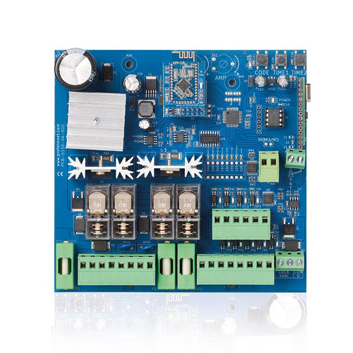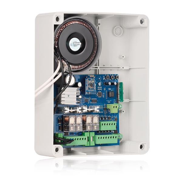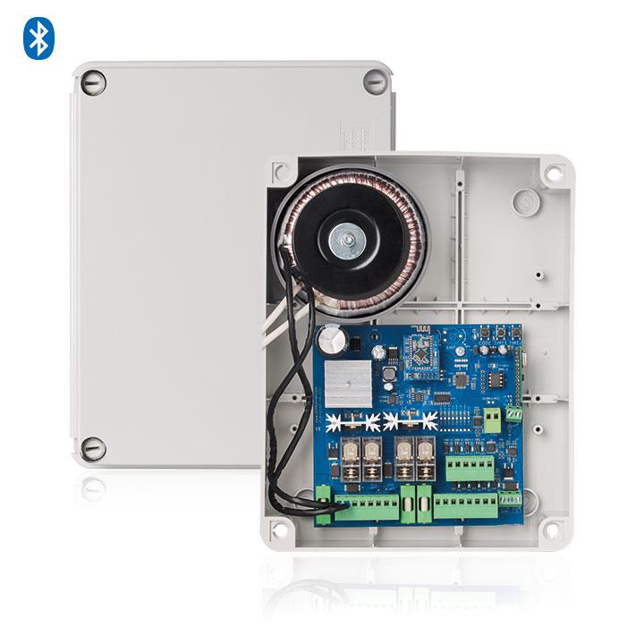 Scheda di comando 2 motori 24V 2x200W, BLUETOOTH, per cancelli ad ante battenti. Programmazione tramite smartphone. Con ricevitore radio 433,92MHz multicodifica (Codice fisso - Rolling - Rolling keeloq, Rolling PN) e circuito carica batteria.